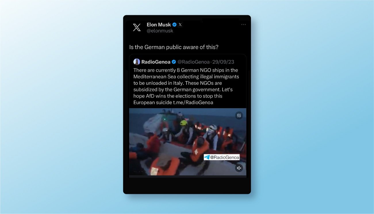 Il problema, però, è alla radice: proprio Elon Musk ha veicolato contenuti fuorvianti attraverso il suo account personale da oltre 150 milioni di follower. Il 29 settembre 2023, ad esempio, il proprietario di X ha ricondiviso un post sul tema dell’immigrazione in Europa, esprimendo disappunto circa le operazioni di salvataggio in mare di diverse organizzazioni non governative (ONG) tedesche impegnate nel Mediterraneo.